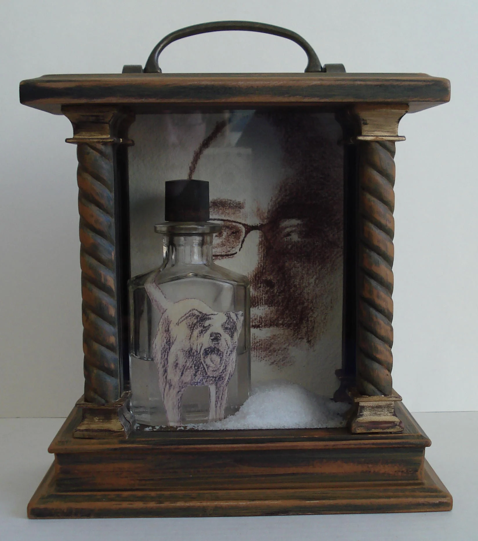 Clock case, salt, glass bottle, liquid, handle, drawn images