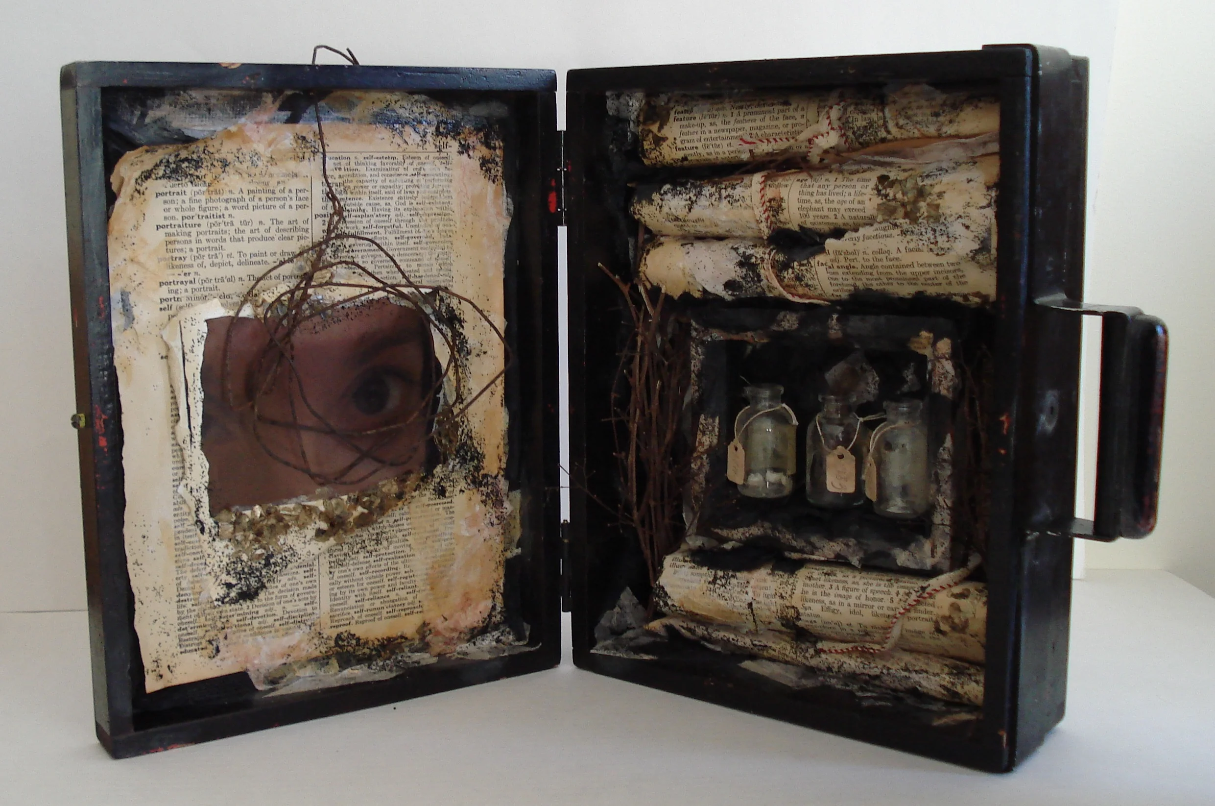 Found box with hinged lid, antique photograph, found papers