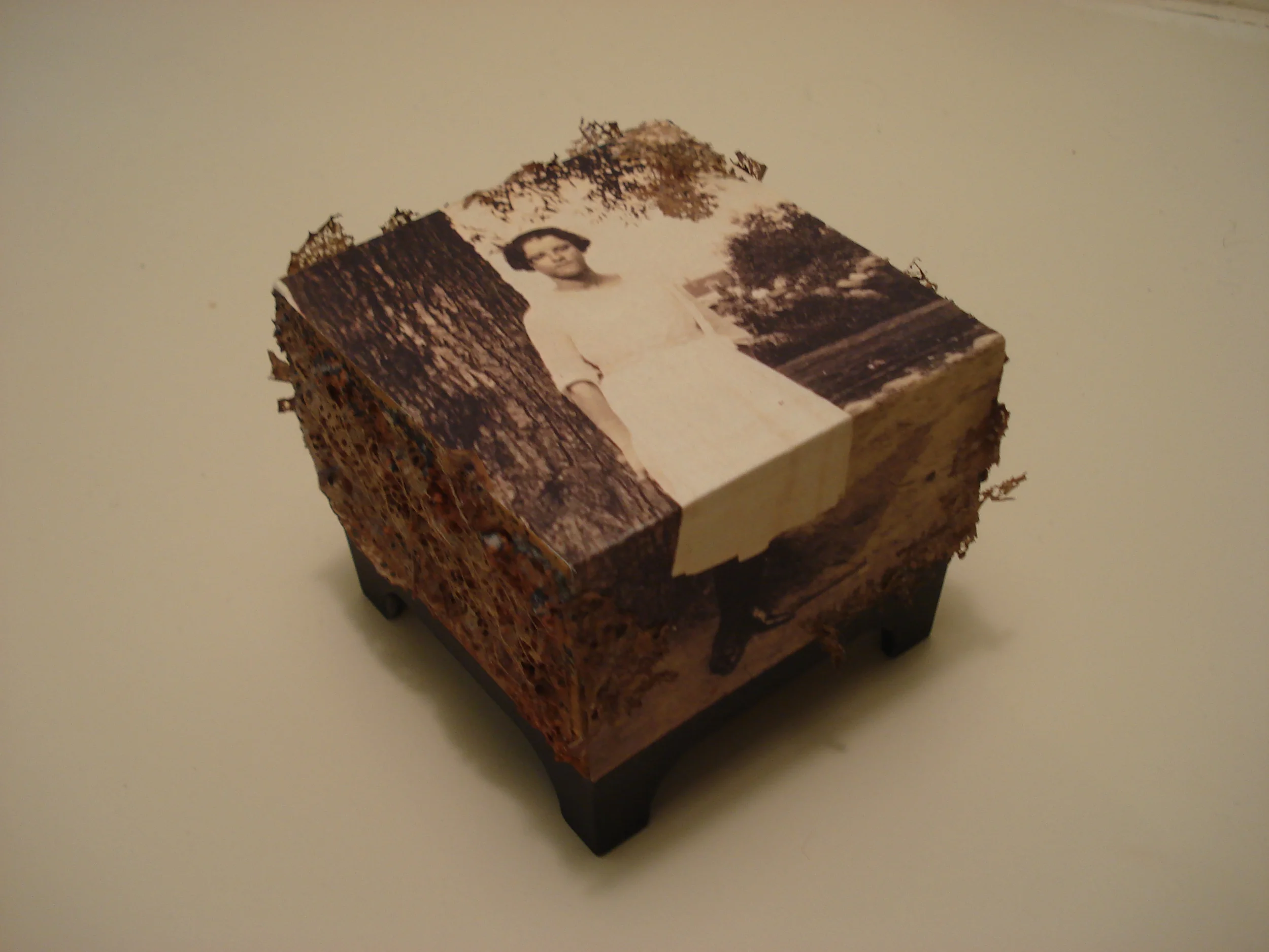 Wood, metal base, antique photograph, leaves