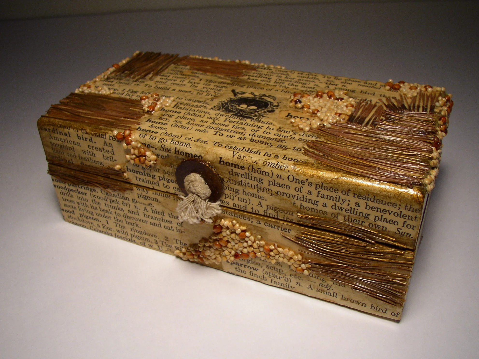 Found box with hinged lid, washer, string, seeds, pine straw, dictionary pages