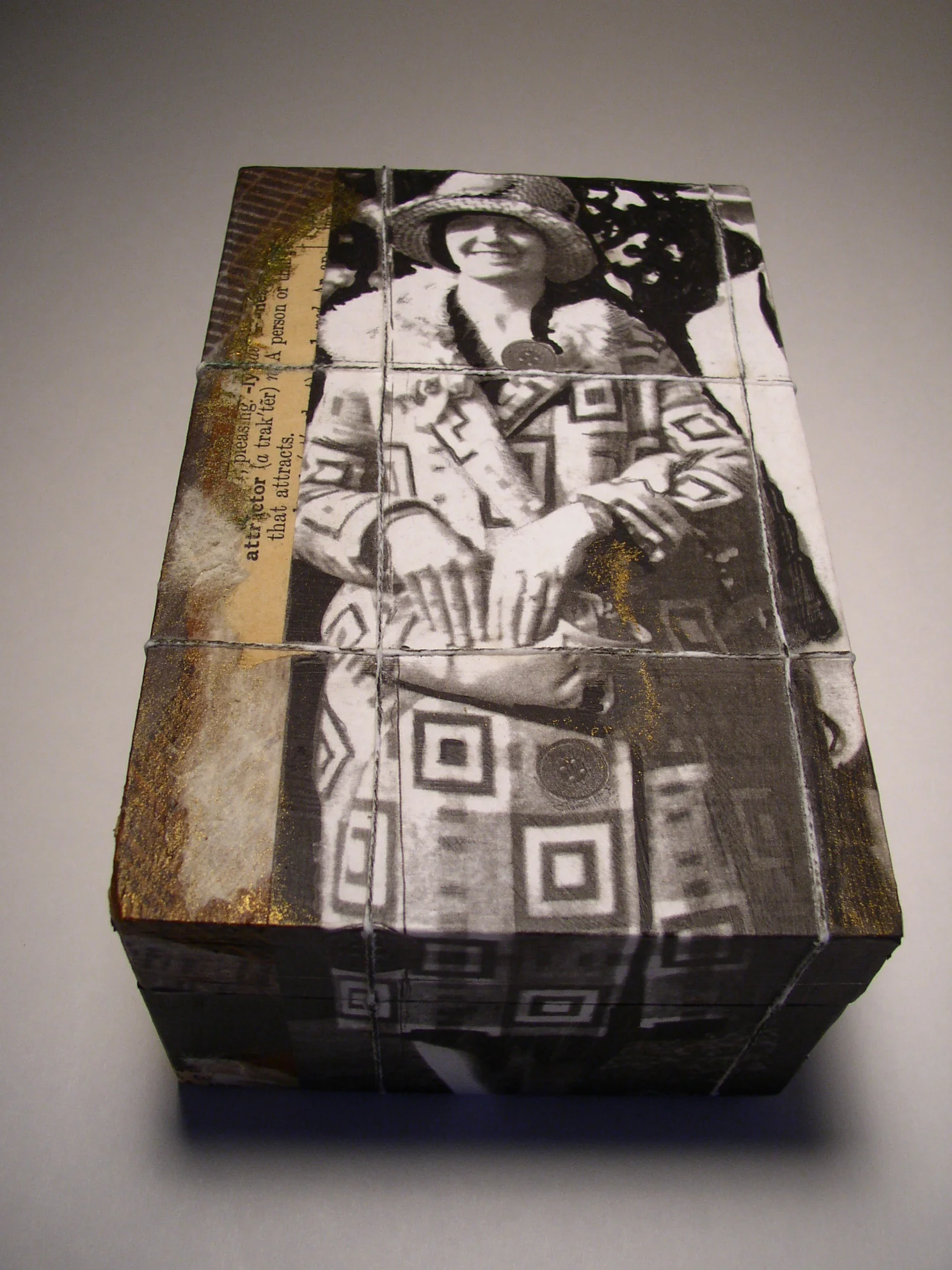 Found box with removable lid, antique photograph, string, handmade papers